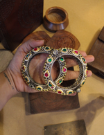Expertly crafted Devi dual tone bangles pair add a touch of elegance to your festive attire. Made with high-quality German silver and adorned with colorful stone motifs, these bangles are a must-have for any occasion. Elevate your style with this beautiful, versatile accessory.