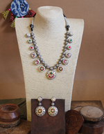 Elevate your festive look with the Juhi Haar, a dual-tone German silver oxidised necklace set adorned with shimmering Vilandi stones. Its adjustable design ensures the perfect fit for every celebration.