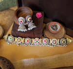 Elevate your festive look with the Kamal Choker, featuring a dual-tone German silver design adorned with intricate flower patterns and vibrant Vilandi gemstones. This exquisite set perfectly blends tradition with colorful elegance to brighten any celebration.