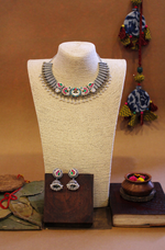 Sarabha is a playful dual-tone necklace crafted from lightweight German silver, adorned with charming gemstone motifs. It's the perfect festive sparkle to brighten your celebrations without weighing you down!